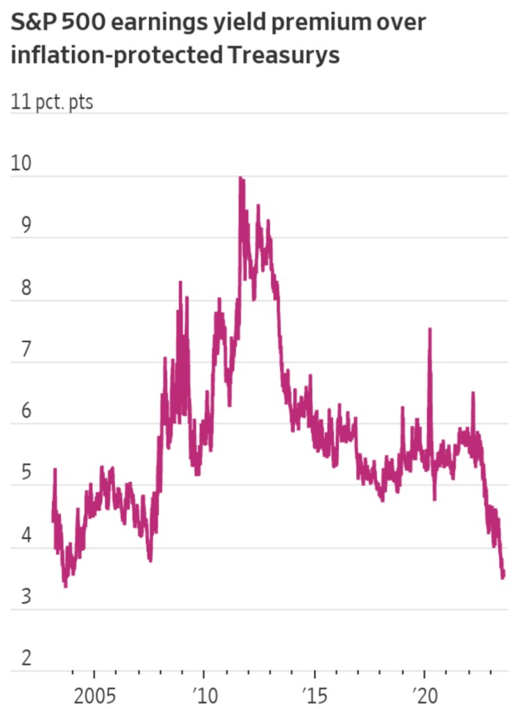 Above is a graph showing the premium of the earnings yield of the S&P 500 over inflation-protected Treasurys. It has fallen over the recent years as bond rates and stock prices rose. The consensus now is that this premium won’t stay low forever-either stock prices fall or bond yields fall, and investors are expecting the latter to happen first. But with the Fed’s stubbornness and perhaps emboldenment by the resilient economy, yields may hold up for quite a while.